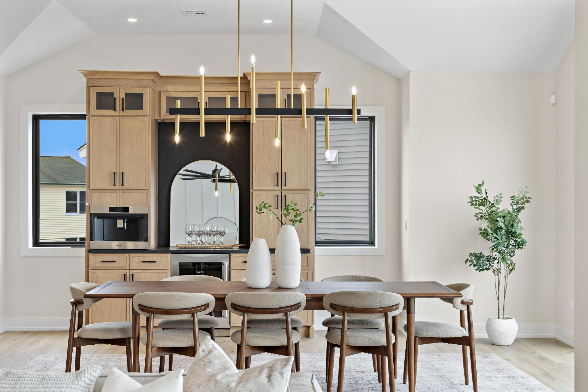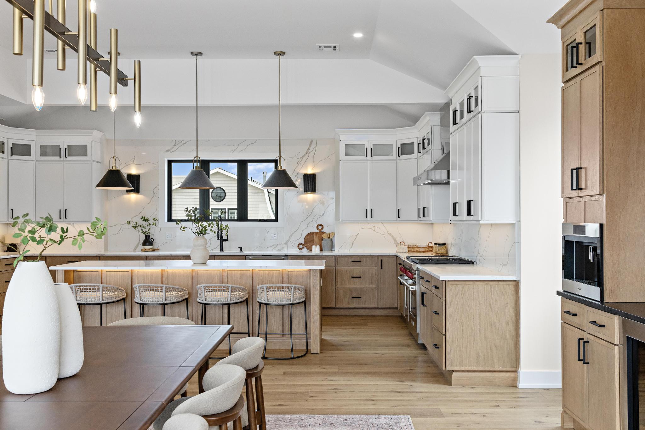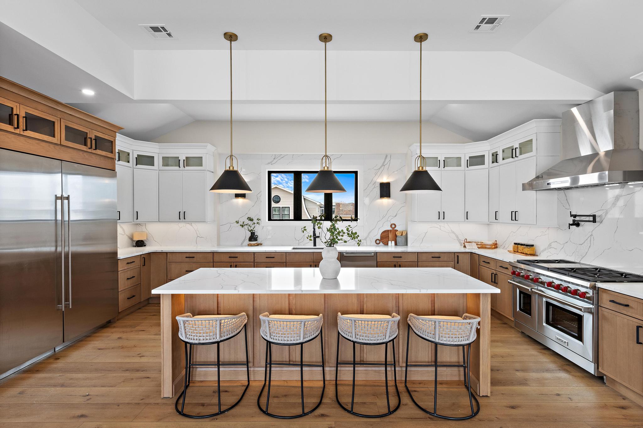 Step into an expansive open floor plan that flows seamlessly from the gourmet kitchen to the bright, airy living and dining areas—each framed by floor-to-ceiling windows offering breathtaking waterfront views. The chef’s kitchen boasts Wolf appliances, custom cabinetry, a generous center island, and a built-in Wolf coffee/dry bar, creating the perfect setting for Sunday brunches or late-night entertaining.