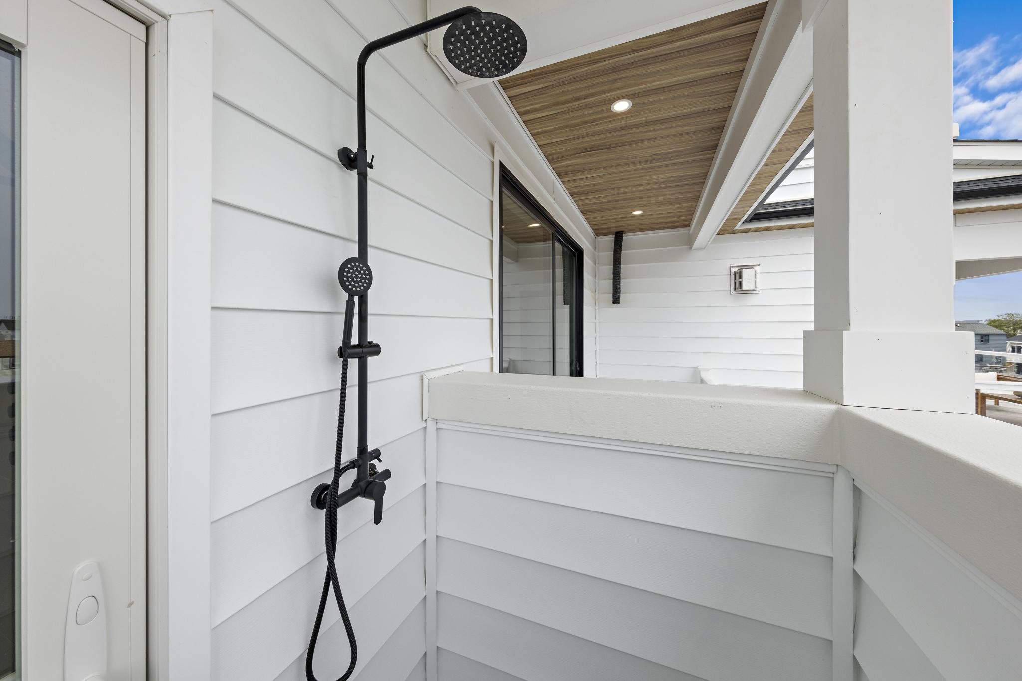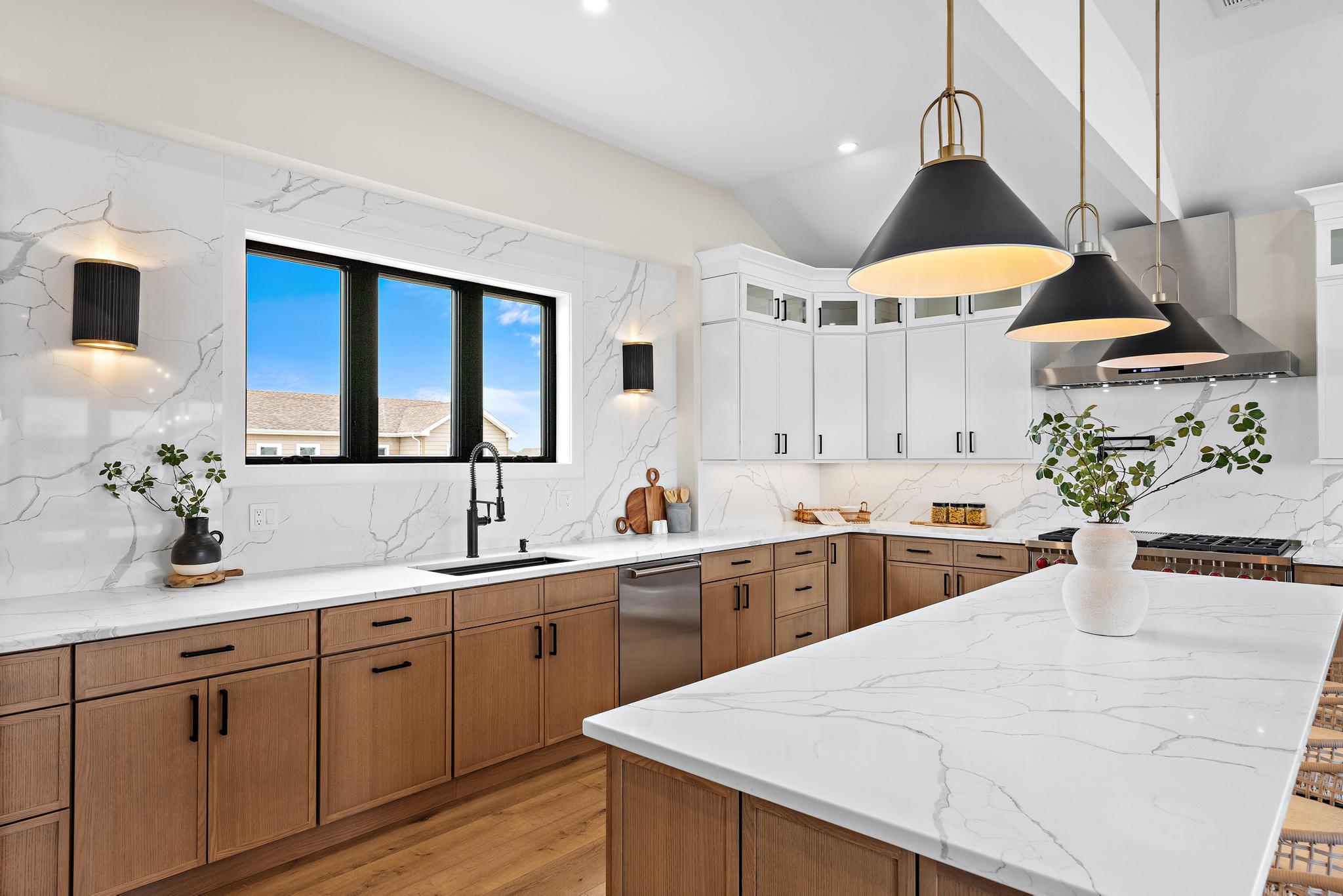 Indoor-outdoor living shines here—step through 12’ and 16’ sliding glass doors onto a large deck that leads down to an outdoor oasis: