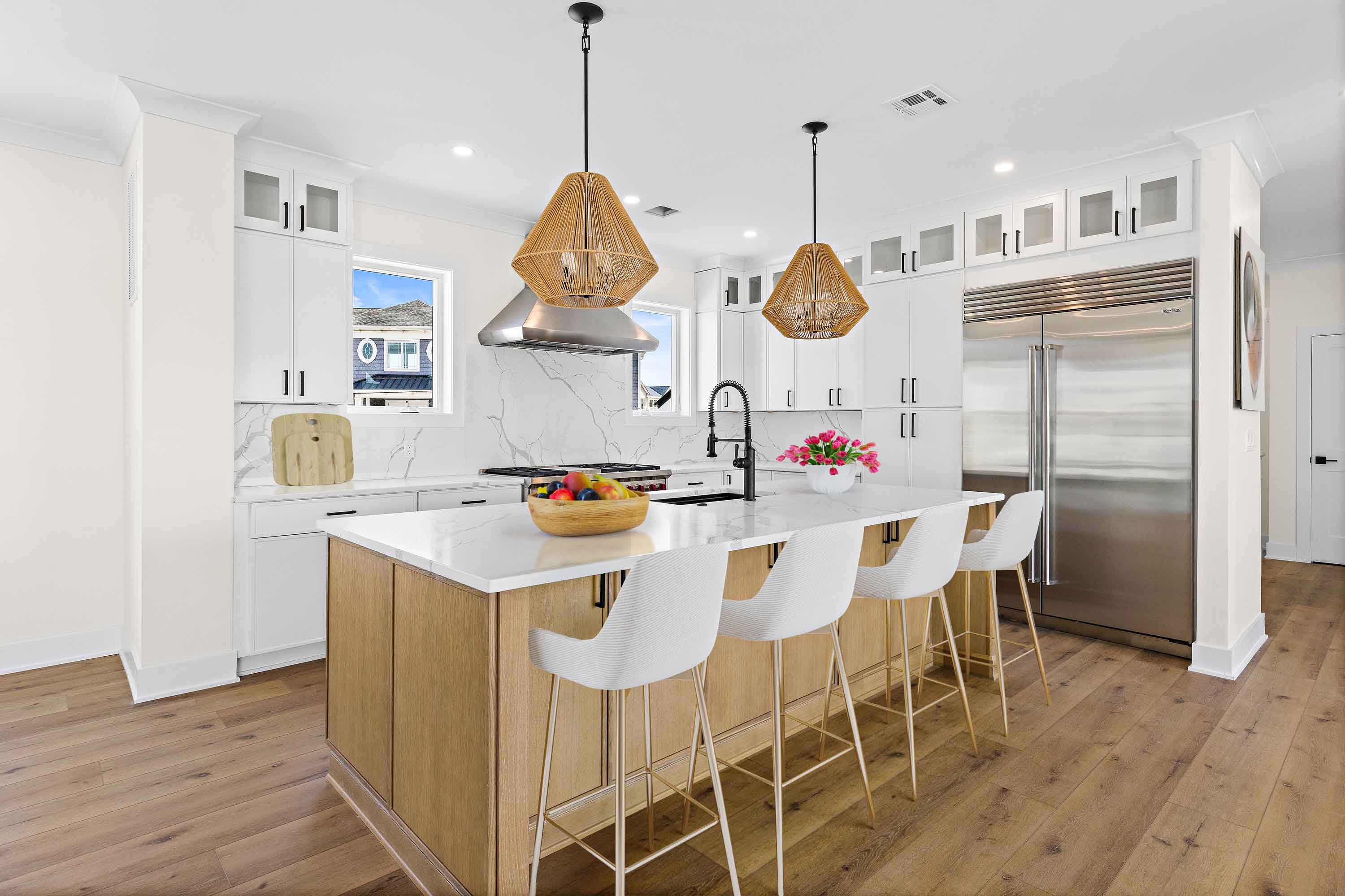Highlight the unique features of the property that embody coastal living combined with elegance. Emphasize the home's open floor plan, natural light, and high-end kitchen amenities such as Wolf appliances, quartz countertops, and custom cabinetry. Focus on the indoor spaces, including the cozy sitting room, dining area, and luxurious owners' suite, illustrating how these elements create an inviting environment for both entertaining and relaxing. - Emphasize Outdoor Amenities and Accessibility